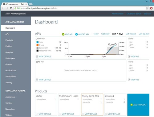 - Analytics. A set of reports about Usage (nr of calls, bandwith ), Health (different views per StatusCode, ResponseTime) and Activity (different views per Developer, API, Products).
