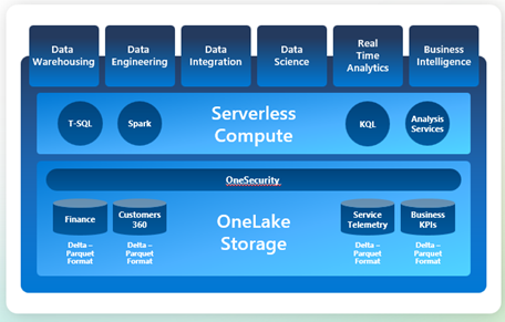 - All compute engines like Sql, Spark, KQL, and Analysis Services store their data automatically in OneLake.