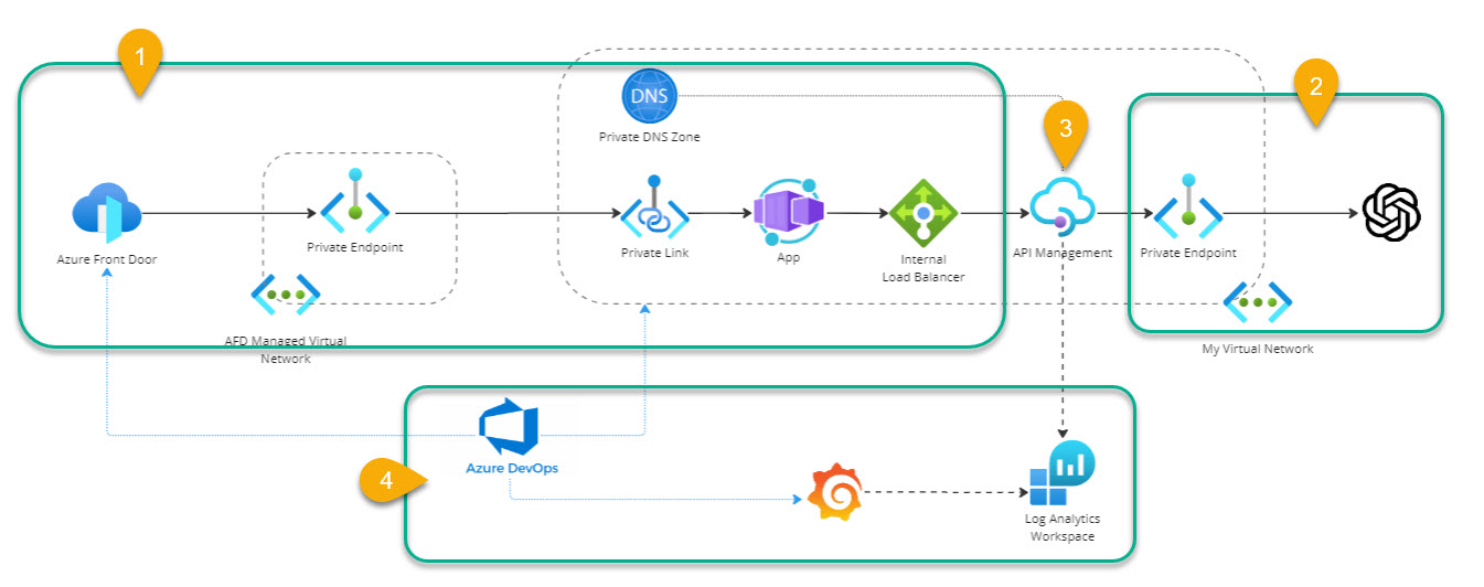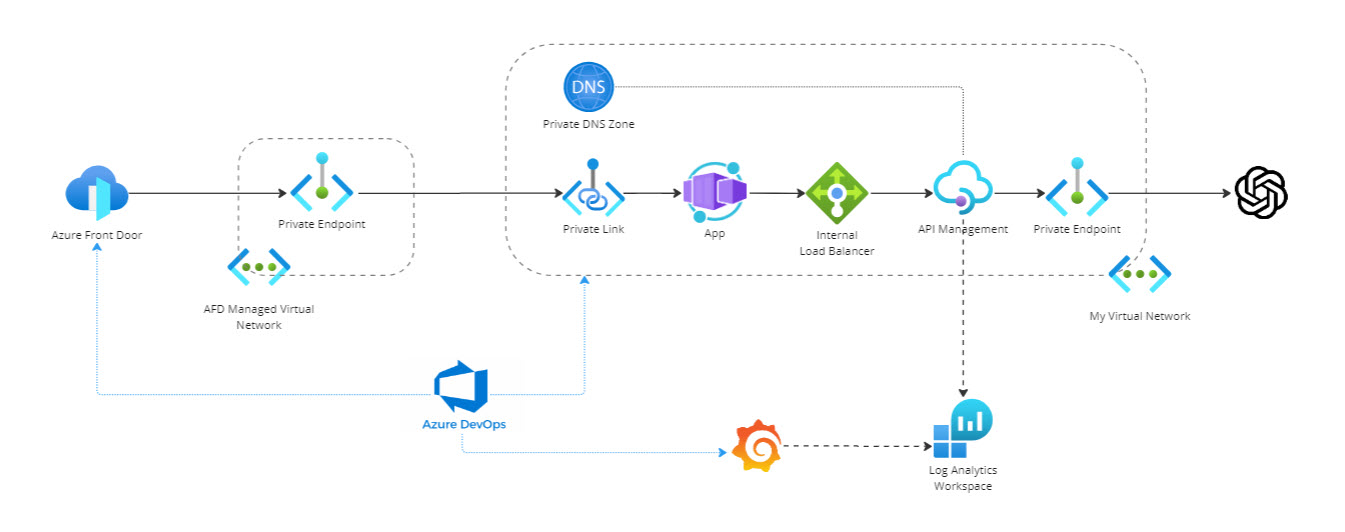 Let’s use a sample application. I have a Chatbot app hosted on App Container Apps exposed to the outside world via Front Door. The Chatbot app consumes the OpenAI API via Azure API Management. The APIM instance is configured in internal mode, and we manage the private DNS zone to resolve the APIM internal load balancer.