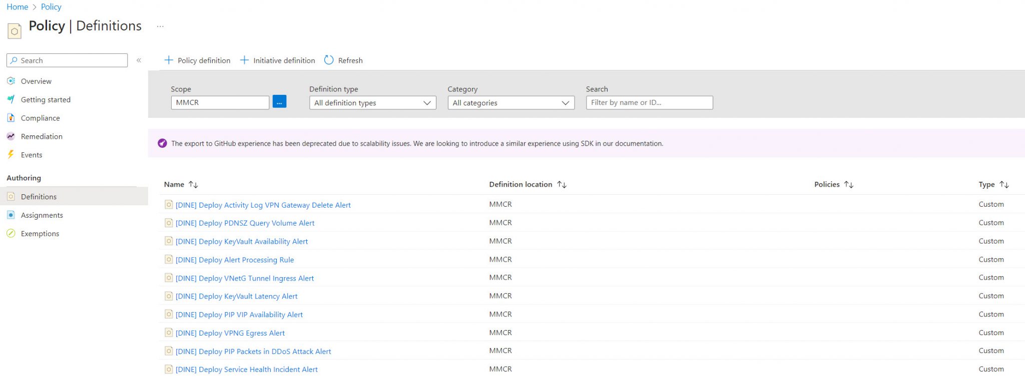 Firstly, run the deployment command to create a set of custom policies. It’s important to create the custom policies in the highest management group possible, normally in the ELZ root management group (the MG beneath the “Tenant Root Group” ). This is because the policy definitions can be created only at or above the policy assignment scope. The command below will create 56 policies prefixed with “[DINE]” (deployIfNotExists).