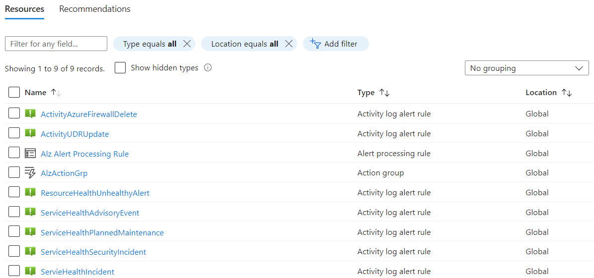 - The Activity Log rules, Alert processing rule and Action group have been created in the resource group we passed as a parameter for the policy assignment.