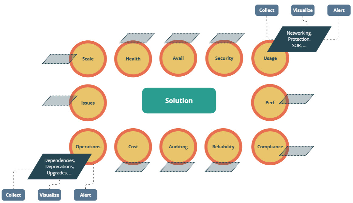 To define a monitoring scope, I normally start from a diagram like the following. For every single area, we define the observability requirements and their CVA, meaning: how to Collect, how to Visualize and how to Alert. Proactive monitoring is essential to maintaining a secure and healthy infrastructure, achieved through detecting and addressing issues promptly.