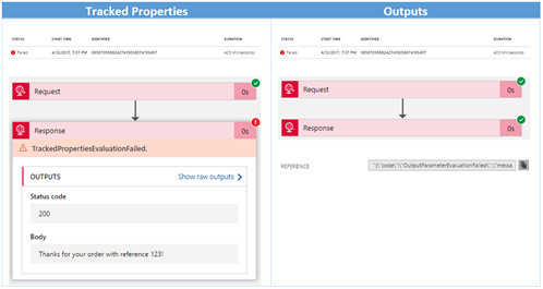 Another important aspect on tracking / monitoring is the fact that it should never influence the runtime behaviour. It’s unacceptable that a Logic App run fails, because a specific data field to be tracked is missing. Let’s have a look what happens in case we try to track a property that does not exist, e.g.: “Reference”: “@{triggerBody()[‘xxx’]}”