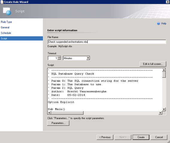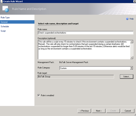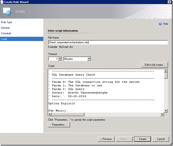 $Target/Property[Type=”Microsoft.BizTalk.Server.2010.BizTalkGroup”]/MgmtDbServerName$ BizTalkDTADb “DECLARE @msgbox nvarchar (500)Set @msgbox = (select top(1) DBserverName from [BizTalkMgmtDb].[dbo].[adm_MessageBox] with (nolock))exec(‘SELECT * FROM [BizTalkDTADb].[dbo].[dtav_ServiceFacts] with (nolock) INNER JOIN [‘ + @msgbox + ‘].BizTalkMsgBoxDb.dbo.InstancesSuspended as msgboxdbinstancesSuspended ON [BizTalkDTADb].[dbo].[dtav_ServiceFacts].[ServiceInstance/InstanceId] = msgboxdbinstancesSuspended.uidInstanceID where [Service/Type] = ”Orchestration” and datediff(minute,[ServiceInstance/StartTime],getutcdate()) between 5 and 15’)”