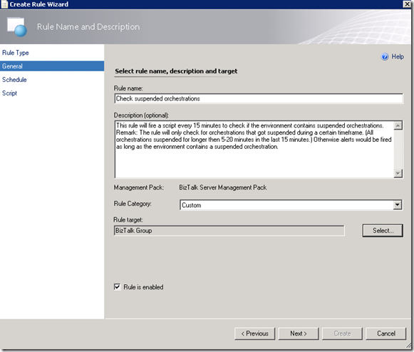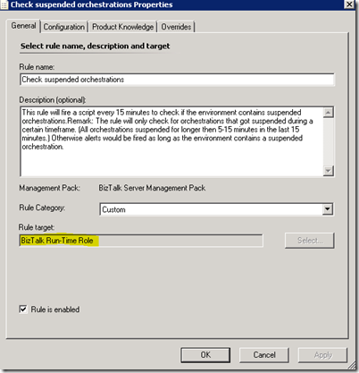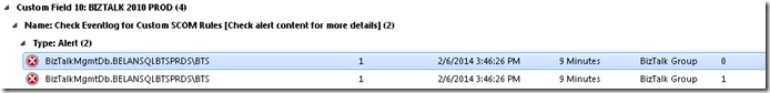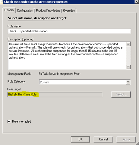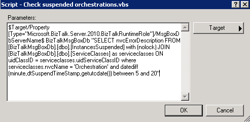 $Target/Property[Type=”Microsoft.BizTalk.Server.2010.BizTalkRuntimeRole”]/MsgBoxDbServerName$ BizTalkMsgBoxDb “SELECT nvcErrorDescription FROM [BizTalkMsgBoxDb].[dbo].[InstancesSuspended] with(nolock) JOIN [BizTalkMsgBoxDb].[dbo].[ServiceClasses] as serviceclasses ON uidClassID = serviceclasses.uidServiceClassID where serviceclasses.nvcName = ‘Orchestration’ and datediff(minute,dtSuspendTimeStamp,getutcdate()) between 5 and 15”