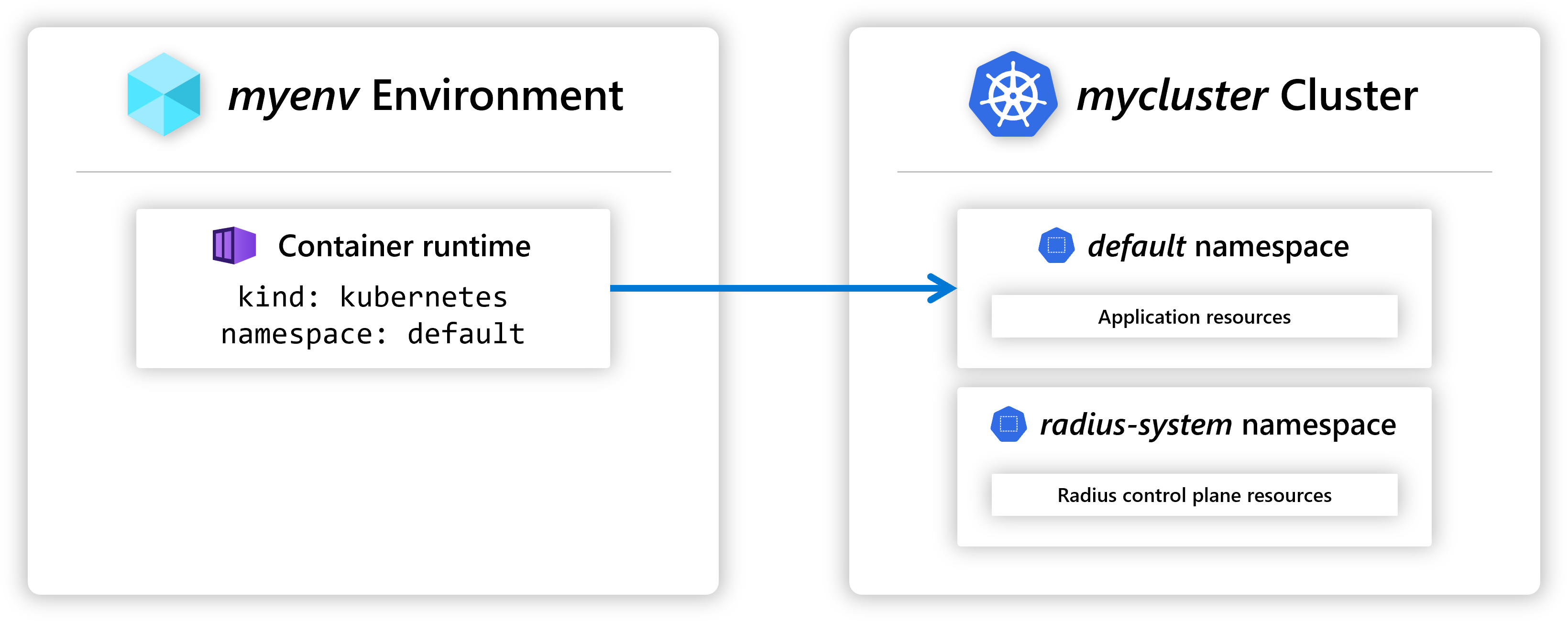 - Create a new environment. Radius Environments are prepared to target configurations. An environment specifies the container runtime, configuration (for example the list of allowed recipes), and other settings like identity provider. By default, the new environment is named default and creates a ‘default’ namespace on the connected Kubernetes cluster.
