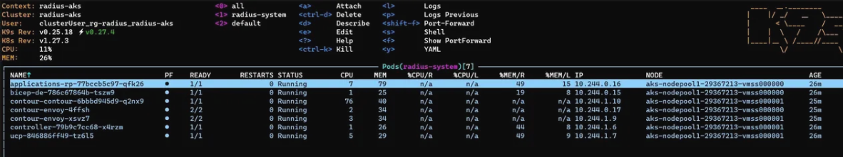 - Install the Radius control plane to the Kubernetes cluster in the radius-system namespace. The following pods are created in the radius-system namespace.