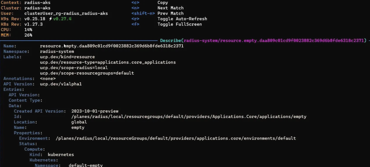 - Create an empty Radius application by executing the following command: “rad deploy empty.bicep –environment default“. As a result of the deployment, a new namespace has been created (“default-empty”) and there is an empty resource in the UCP. Note: by default, Radius concatenates the application name to the namespace associated with the environment. You can change this behavior by adding the ‘kubernetesNamespace’ key to the extensions property of your Radius application.
