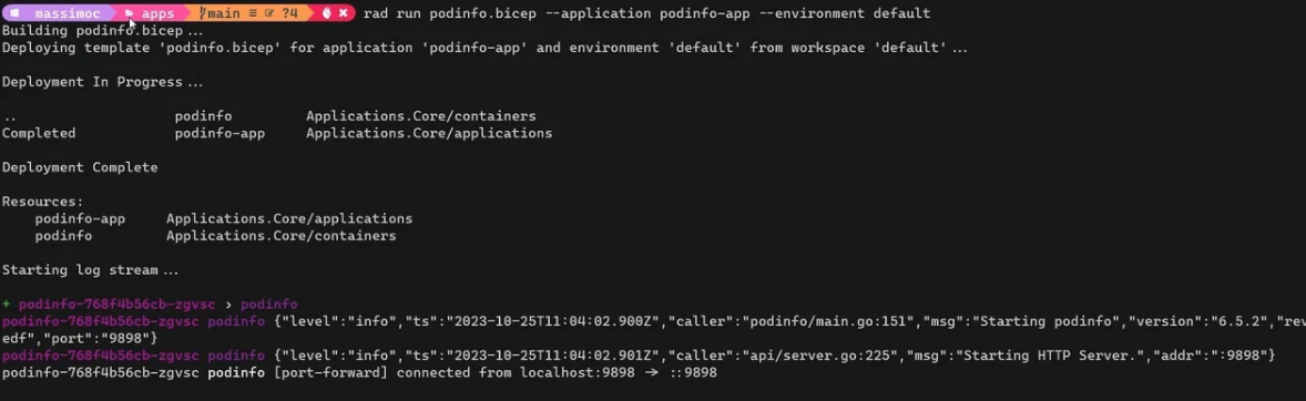 - Let’s now add a single container to our app (see example) and execute the following command “rad run podinfo.bicep –application podinfo-app –environment default“. Note that instead of using the “rad deploy” command, at this step we are using “rad run”. This is the easiest way to deploy and perform a first test of your Radius application because the run command will trigger the app deployment, enable the port forwarding, and stream all the logs to your development console.