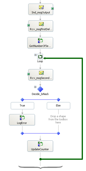The orchestration sends the Output message, which is then picked up by the Send Port Group and sent to any number of locations. The orchestration uses a custom function to determine the number of Send Ports in the Send Port Group and uses this as a parameter in the Loop expression. In the Loop the Delivery Notification messages are received, if a NACK message is received the error message is logged.