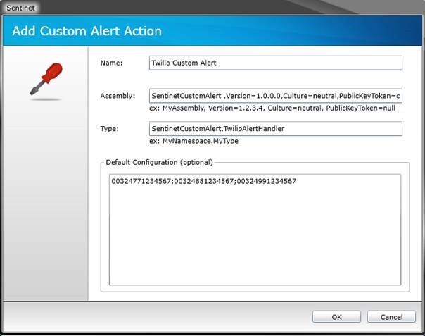 - Assembly: The fully qualified assembly name that contains the custom alert