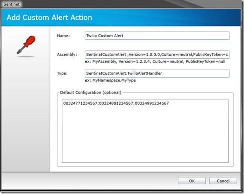 - Default Configuration: The optional default configuration. In this example I specified a CSV value of difference phone number. You can access this value inside your class that implements the IAlertHandler interface.