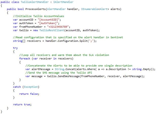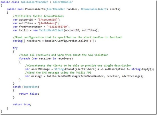 The final implementation of our custom Alert Handler looks like below. We start by initializing some variables needed for Twilio. After that everything is pretty straight forward. We read our handler configuration, here we made the choice for a CSV configuration string, but you can perfectly go for an XML configuration and parse it to an XMLDocument or XDocument.