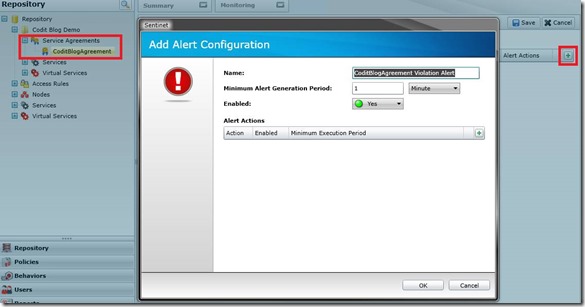 In the Sentinet Repository window, click on the Service Agreements and navigate to alerts and then choose add Alert. Following screen will popup.
