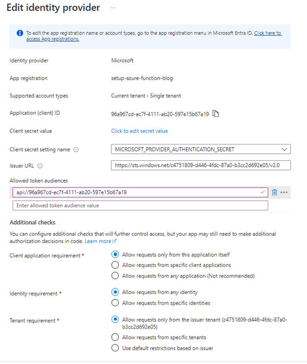 If you have two Azure Functions that are communicating with each other, and the receiving Azure Function has identity provider enabled, the client requirement needs to be set to “Allow Requests from Specific Client Applications.” You must provide the function ID in the text box that appears. If you have multiple Azure Functions or any other resources, you can provide the IDs separated by a semicolon (;).