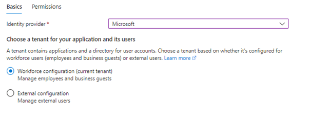 In the first part option, leave Workforce configuration selected, as we would want to only authorize with our current tenant.