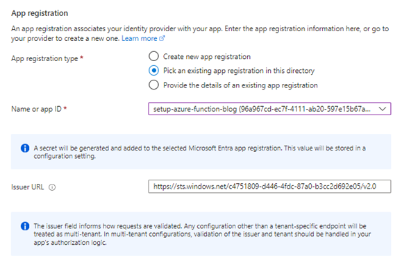 An application registration is required for the authentication setup between your Azure resource and the authentication platform. This ensures that only Azure resources connected to this application registration are allowed to communicate with the Azure resource, such as an Azure Function. Anyone without the provided token will not be permitted to access the Azure resource.