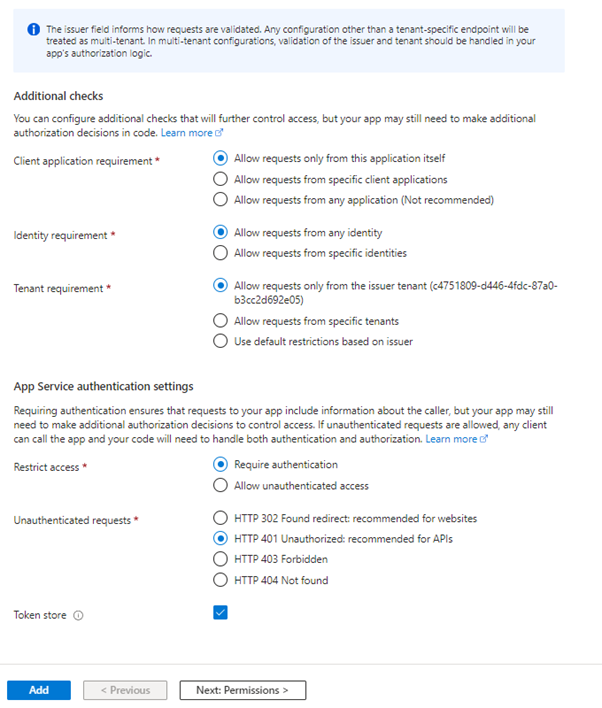 - Use default restrictions based on issuer: This option applies the default restrictions based on the issuer of the token. It is a more generalized setting that leverages the built-in rules of the authentication provider.