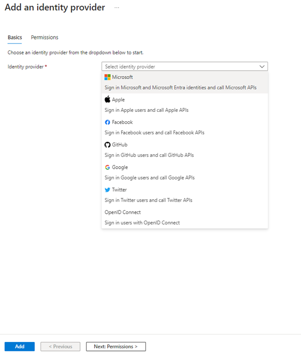 Click on Add Identity provider – in the next step, from the dropdown box, select “Microsoft”.