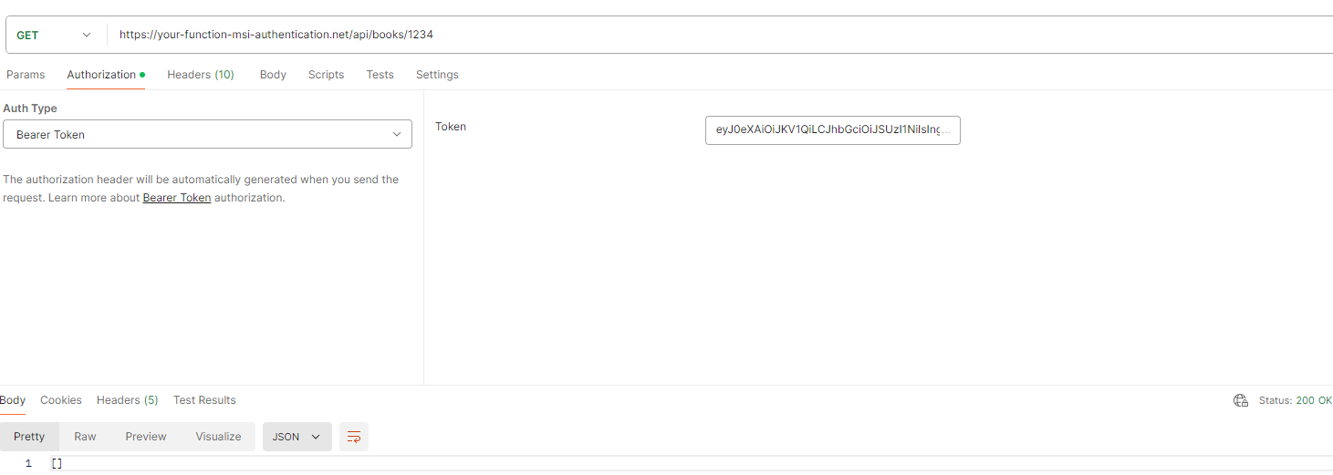 In the screenshot below, a correctly generated access token from Azure Active Directory is passed. Since the access token is valid, the request is processed, and a result is returned.