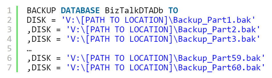 As we start this job for the first time, by default he will create a .BAK file with a size of 3,8 terabyte. That is something we want to avoid. So we will run a manual backup command that creates 60 smaller .BAK files. Then the files are easier to handle. After this, we also add a record to the ‘dta_ArchiveHistory’ to simulate a automated backupjob.