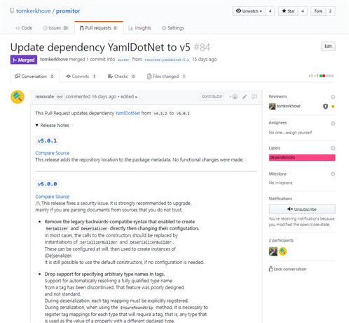 Using Renovate was also an eye-opener on the importance of having good GitHub releases. These really help consumers of products to get a good understanding of what changed and what to expect when updating. Having these in the update pull requests is really nice.