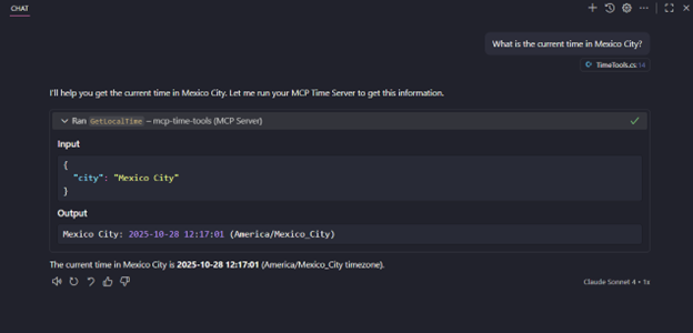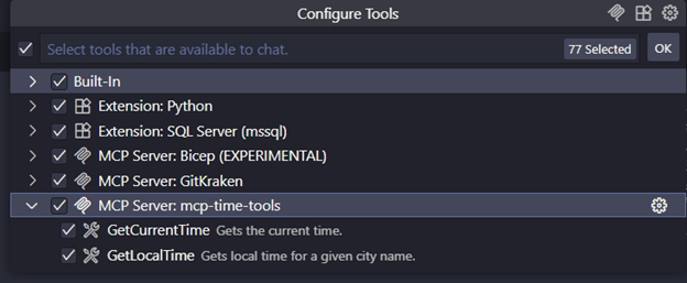4. You can start using your MCP server. It will automatically discover the tools exposed by your MCP server — in my case, the time-tools.